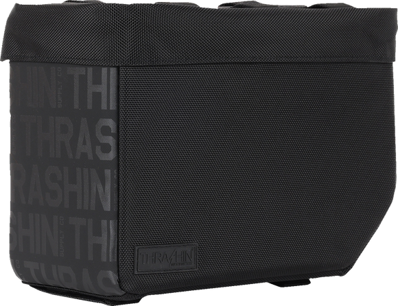 Saddlebags with a clean, minimalist look and durable materials, One-piece *L* shaped backing for increased load capacity, 1680 Denier ballistic nylon, TPU material with black on black THRASHIN print, Hi-viz orange interior, MOLLE attachment points on lid, Pair with the Strap Kit & Passenger Bag (sold separately), Easy-on, easy off installation, Maximum fender width of 12*, Bag mounting brackets included, which are mounted in between strut and fender, Fits on a wide variety of motorcycles., Works with most stock tail lights and blinker assemblies., Works with sissybar/backrest, fixed or detachable.,