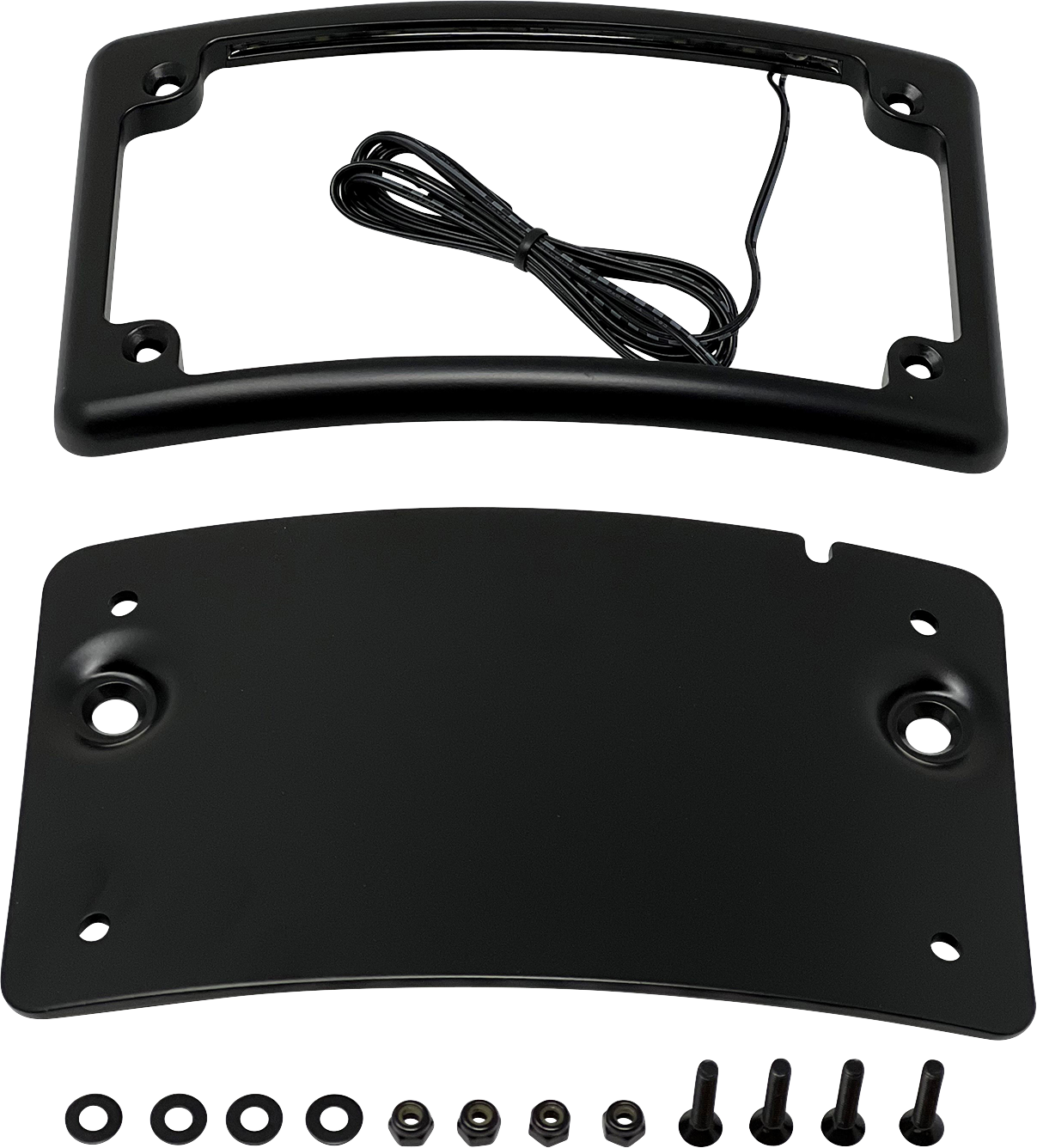 Curved horizontal motorcycle license plate kit, Frame is low profile aluminum construction, Very bright white LED*s, For use with Kodlin license plate bracket part # 2030-2165 for Sportster S models and 2030-2165 for M8 Softail models